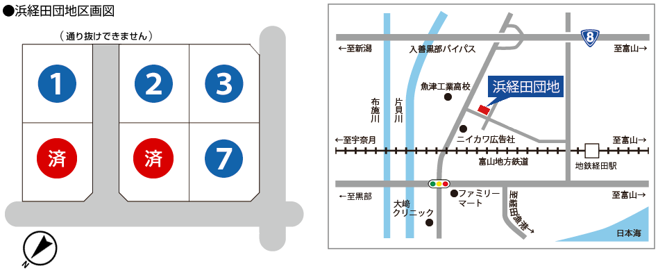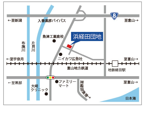 | 交通 | 最寄りバス停「泉町」停留所まで徒歩約1~2分 「魚津市民バス」に乗車⇒あいの風とやま鉄道 魚津駅まで約25分 富山地方鉄道 経田駅まで徒歩約7~8分 |
